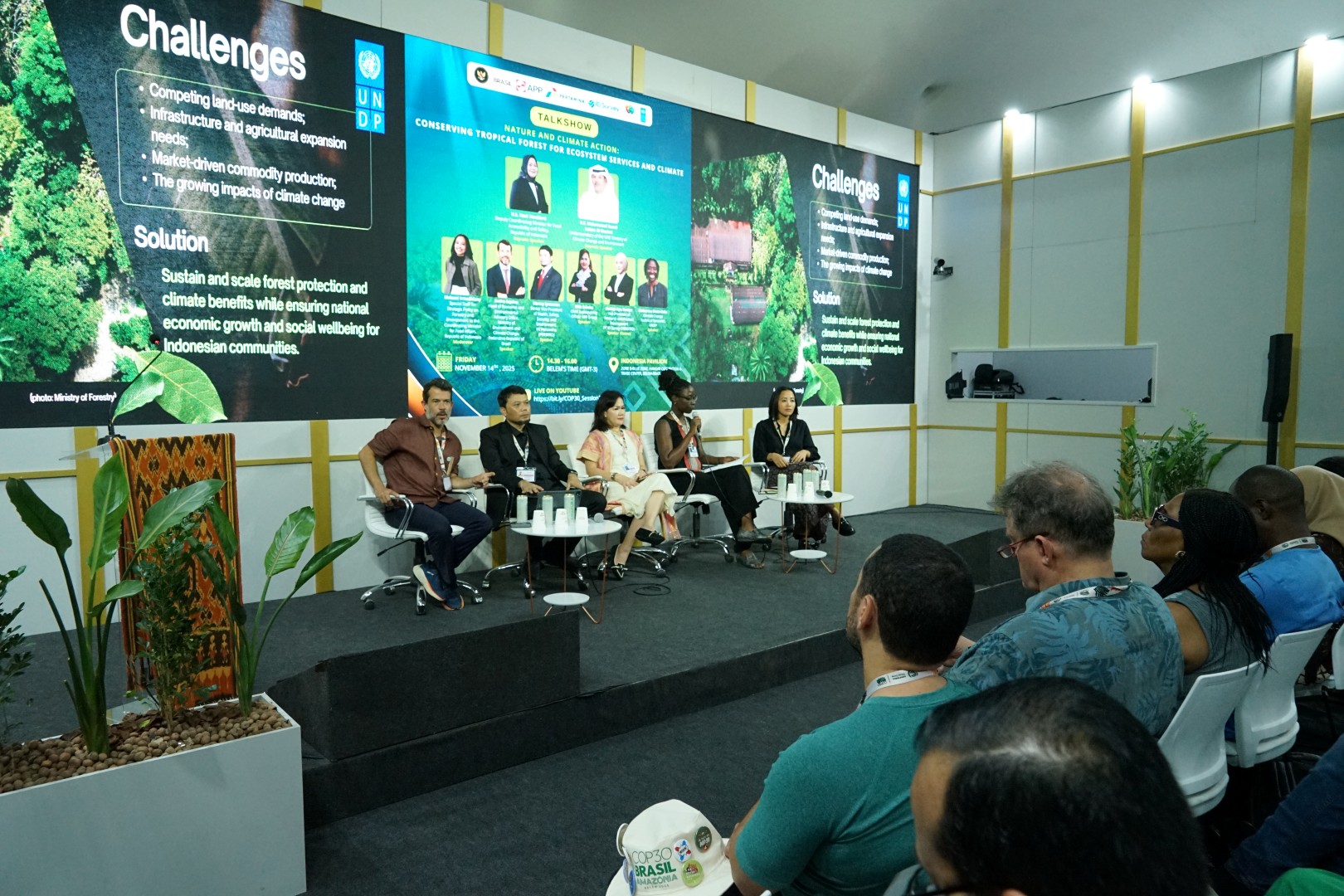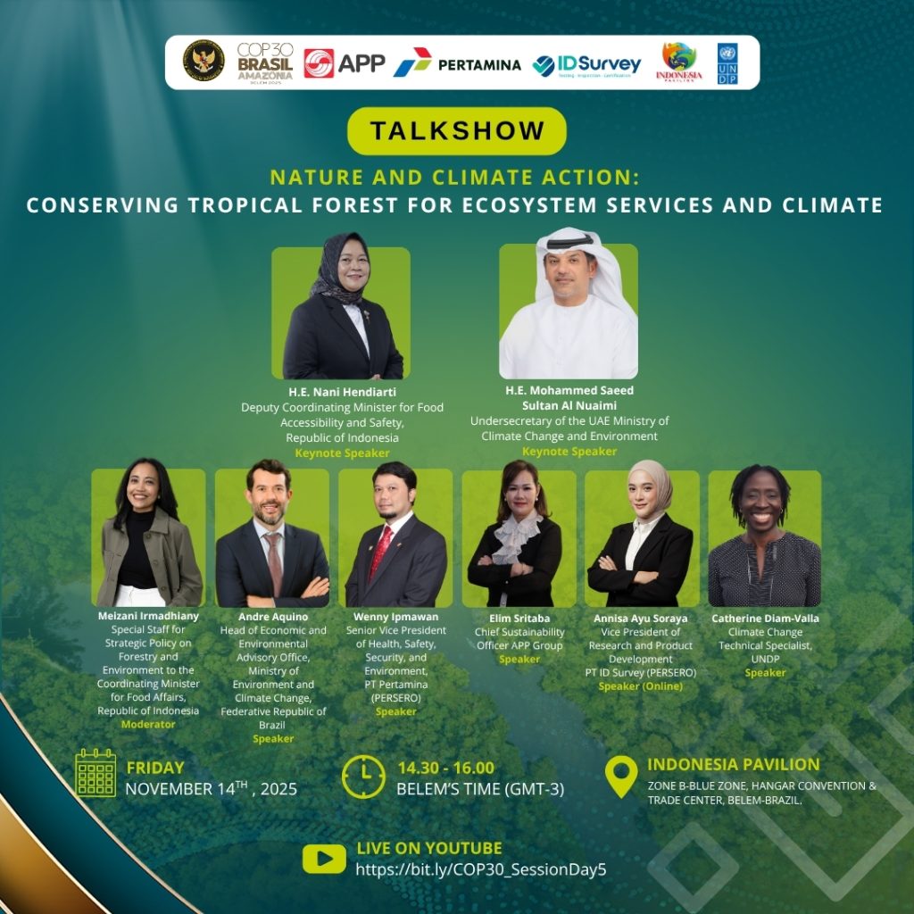 Tropical forests play a critical role in supporting human well-being, food security, water security, prevent from natural disaster, such as flood and landslides, maintenance biodiversity and natural climate regulation. However, tropical forest facing many challenges, such as deforestation and forest degradation, population development pressures, economic demands, and climate change International community put emphasis on the need to preserve the remaining tropical forests. Commitment to tackle challenges as well as capacity building and innovation in tropical forest management are on-going efforts. There are an increasingly aware on the need to balance social-economic-environmental function of tropical forest. Global support for tropical forest countries to enhance their tropical forest management has been pledged in several international fora, namely in biodiversity and climate change. Yet, this noble effort has not been met with financial support. The tropical forest countries must come together with innovative scheme of funding and financing to improve their tropical forest management. This session at COP30, Indonesian Pavilion will exchange views, experiences and best practices on sustainable forest management and climate action as well as encourage cooperation between governments, global financial organizations, and other stakeholders in order to safeguard forests and contribute to climate action.