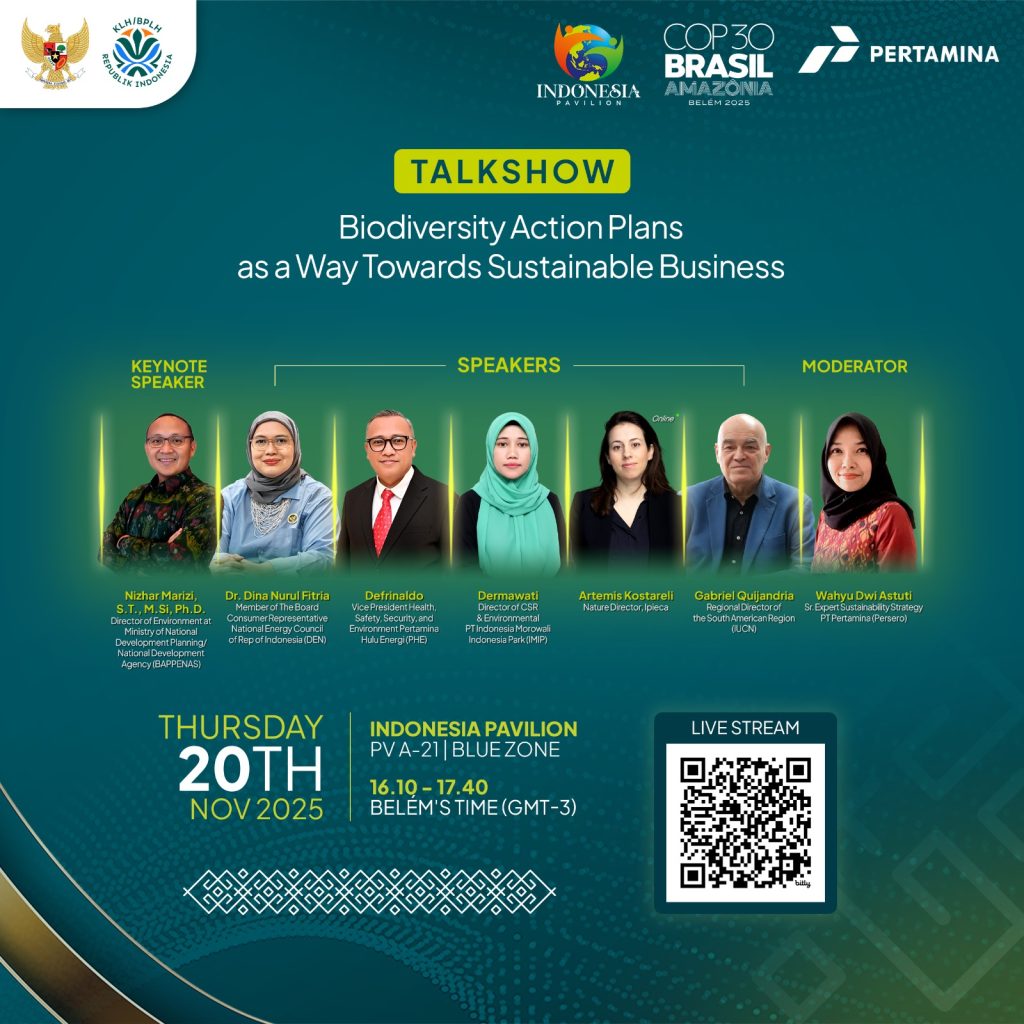 In this context, the session on “Biodiversity Corridors in a Warming World: Enhancing Ecosystem Connectivity for Climate Adaptation” at the COP30 Indonesia Pavilion aims to share knowledge and implementation on how biodiversity planning—through Pre-BAP screenings and BAP—can support the integration of ecological connectivity into both new and existing projects. One of the case studies to be presented will highlight the approach taken by Pertamina Hulu Energi, a subholding of PT Pertamina (Persero), in aligning biodiversity conservation with the operational realities of the oil and gas sector.